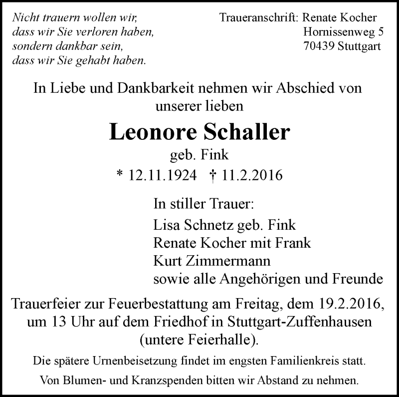 Hier finden Sie alle Traueranzeigen aus der Zeitung, die bisher für Leonore Schauer erschienen sind. Weitere Traueranzeigen, die in der Zeitung erscheinen, werden hier ebenfalls aufgelistet