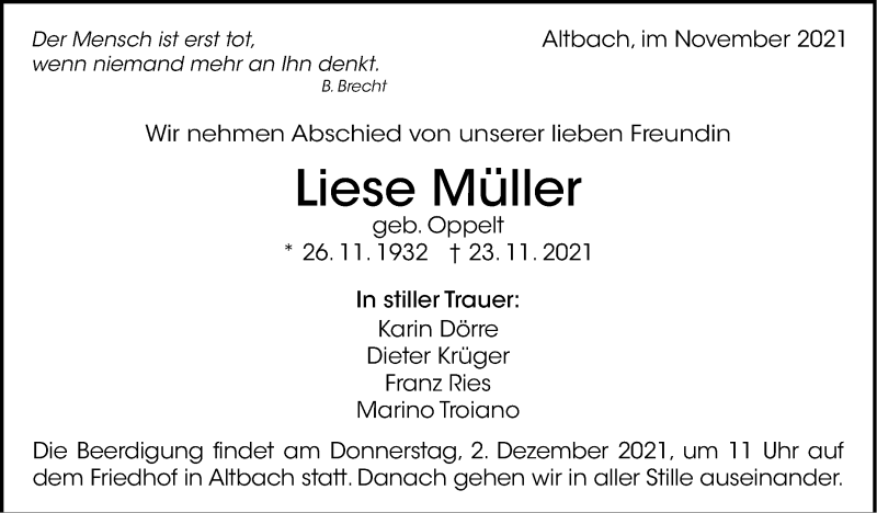Hier finden Sie alle Traueranzeigen aus der Zeitung, die bisher für Liese Müller erschienen sind. Weitere Traueranzeigen, die in der Zeitung erscheinen, werden hier ebenfalls aufgelistet