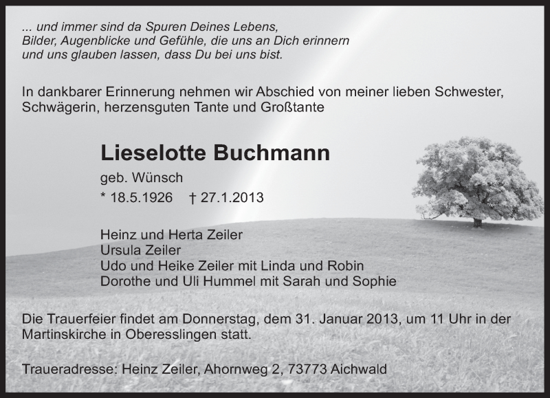 Hier finden Sie alle Traueranzeigen aus der Zeitung, die bisher für Lieselotte Buchmann erschienen sind. Weitere Traueranzeigen, die in der Zeitung erscheinen, werden hier ebenfalls aufgelistet
