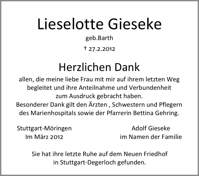 Hier finden Sie alle Traueranzeigen aus der Zeitung, die bisher für Lieselotte Gieseke erschienen sind. Weitere Traueranzeigen, die in der Zeitung erscheinen, werden hier ebenfalls aufgelistet