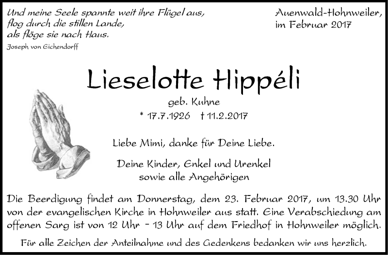 Hier finden Sie alle Traueranzeigen aus der Zeitung, die bisher für Lieselotte Hippeli erschienen sind. Weitere Traueranzeigen, die in der Zeitung erscheinen, werden hier ebenfalls aufgelistet
