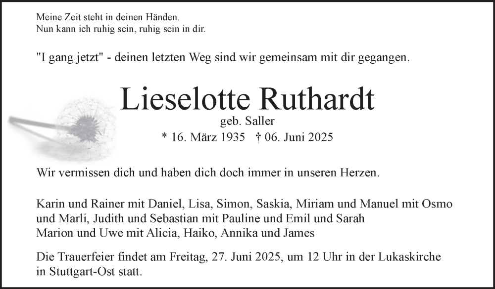 Hier finden Sie alle Traueranzeigen aus der Zeitung, die bisher für Lieselotte Ruthardt erschienen sind. Weitere Traueranzeigen, die in der Zeitung erscheinen, werden hier ebenfalls aufgelistet