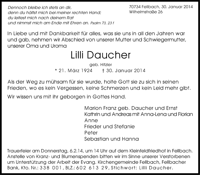 Hier finden Sie alle Traueranzeigen aus der Zeitung, die bisher für Lilli Daucher erschienen sind. Weitere Traueranzeigen, die in der Zeitung erscheinen, werden hier ebenfalls aufgelistet