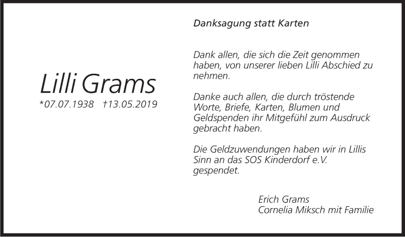 Hier finden Sie alle Traueranzeigen aus der Zeitung, die bisher für Lilli Grams erschienen sind. Weitere Traueranzeigen, die in der Zeitung erscheinen, werden hier ebenfalls aufgelistet