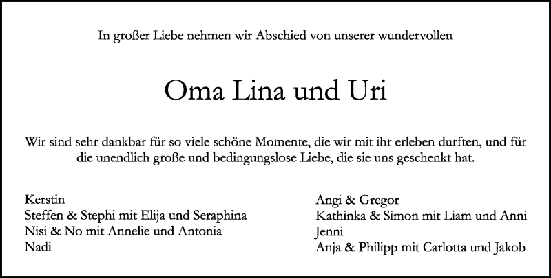 Hier finden Sie alle Traueranzeigen aus der Zeitung, die bisher für Lina erschienen sind. Weitere Traueranzeigen, die in der Zeitung erscheinen, werden hier ebenfalls aufgelistet