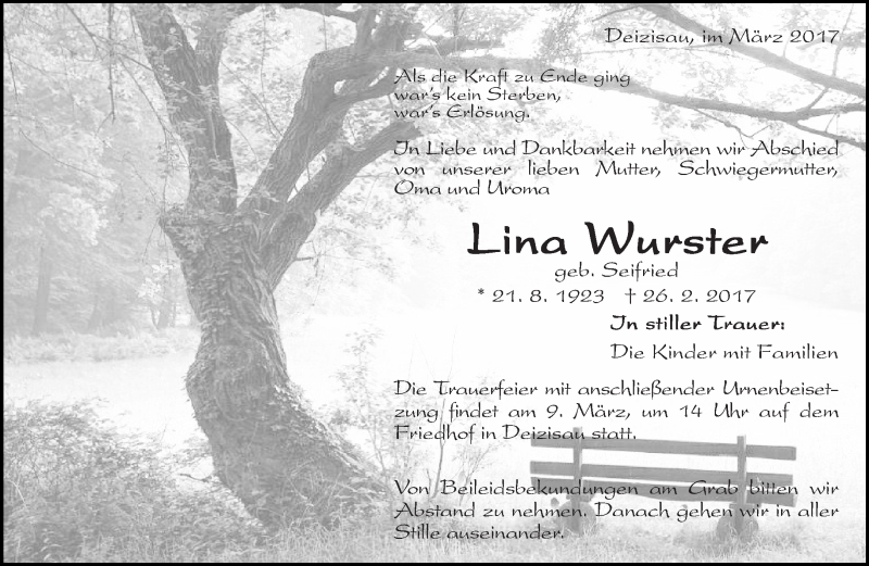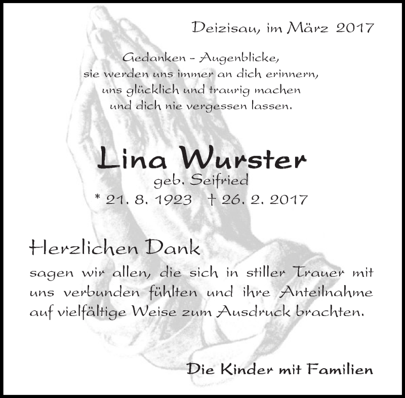Hier finden Sie alle Traueranzeigen aus der Zeitung, die bisher für Lina Wurster erschienen sind. Weitere Traueranzeigen, die in der Zeitung erscheinen, werden hier ebenfalls aufgelistet