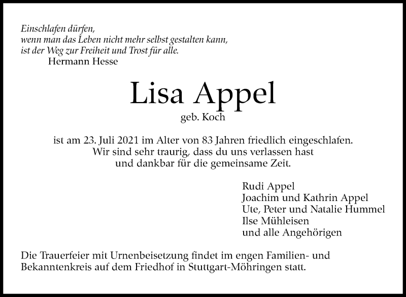 Hier finden Sie alle Traueranzeigen aus der Zeitung, die bisher für Lisa Appel erschienen sind. Weitere Traueranzeigen, die in der Zeitung erscheinen, werden hier ebenfalls aufgelistet