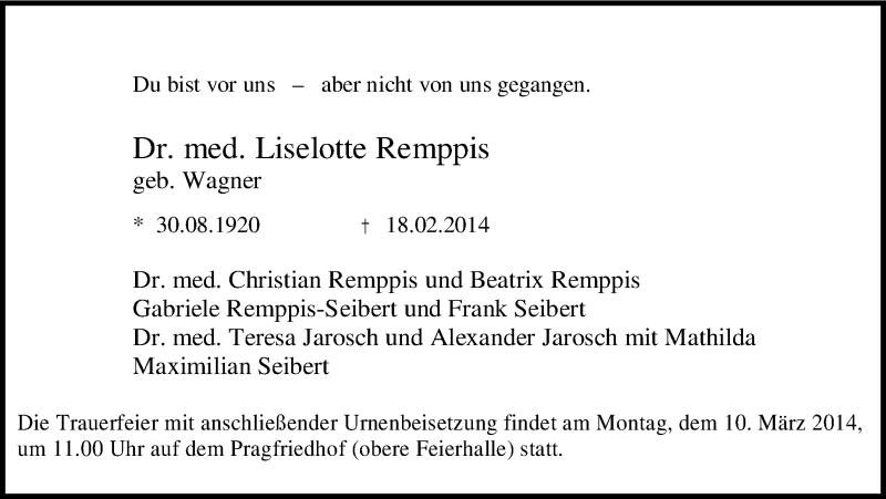 Hier finden Sie alle Traueranzeigen aus der Zeitung, die bisher für Liselotte Remppis erschienen sind. Weitere Traueranzeigen, die in der Zeitung erscheinen, werden hier ebenfalls aufgelistet