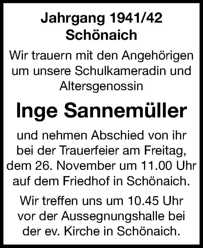 Hier finden Sie alle Traueranzeigen aus der Zeitung, die bisher für lnge Sannemüller erschienen sind. Weitere Traueranzeigen, die in der Zeitung erscheinen, werden hier ebenfalls aufgelistet