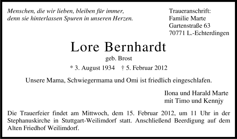 Hier finden Sie alle Traueranzeigen aus der Zeitung, die bisher für Lore Bernhardt erschienen sind. Weitere Traueranzeigen, die in der Zeitung erscheinen, werden hier ebenfalls aufgelistet