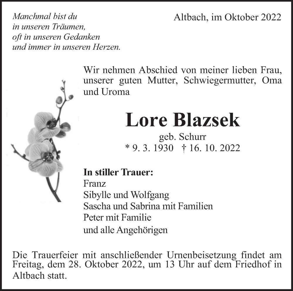 Hier finden Sie alle Traueranzeigen aus der Zeitung, die bisher für Lore Blazsek erschienen sind. Weitere Traueranzeigen, die in der Zeitung erscheinen, werden hier ebenfalls aufgelistet