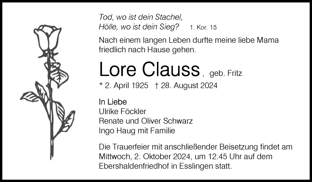 Hier finden Sie alle Traueranzeigen aus der Zeitung, die bisher für Lore Clauss erschienen sind. Weitere Traueranzeigen, die in der Zeitung erscheinen, werden hier ebenfalls aufgelistet