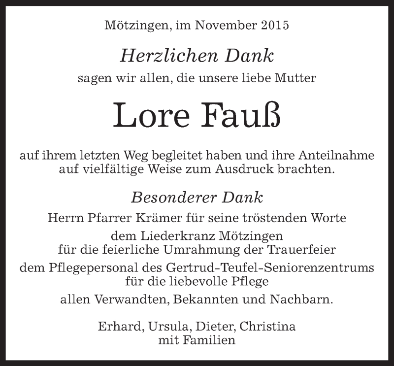 Hier finden Sie alle Traueranzeigen aus der Zeitung, die bisher für Lore Fauß erschienen sind. Weitere Traueranzeigen, die in der Zeitung erscheinen, werden hier ebenfalls aufgelistet