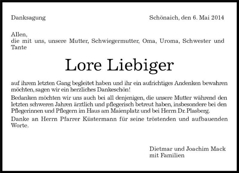 Hier finden Sie alle Traueranzeigen aus der Zeitung, die bisher für Lore Liebiger erschienen sind. Weitere Traueranzeigen, die in der Zeitung erscheinen, werden hier ebenfalls aufgelistet