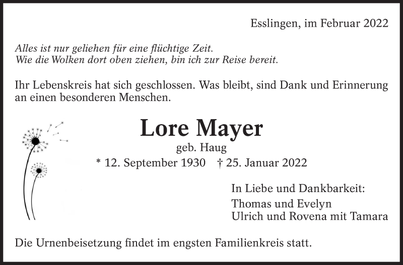 Hier finden Sie alle Traueranzeigen aus der Zeitung, die bisher für Lore Mayer erschienen sind. Weitere Traueranzeigen, die in der Zeitung erscheinen, werden hier ebenfalls aufgelistet