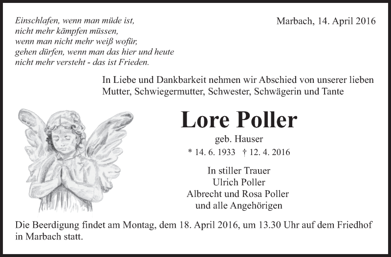 Hier finden Sie alle Traueranzeigen aus der Zeitung, die bisher für Lore Poller erschienen sind. Weitere Traueranzeigen, die in der Zeitung erscheinen, werden hier ebenfalls aufgelistet