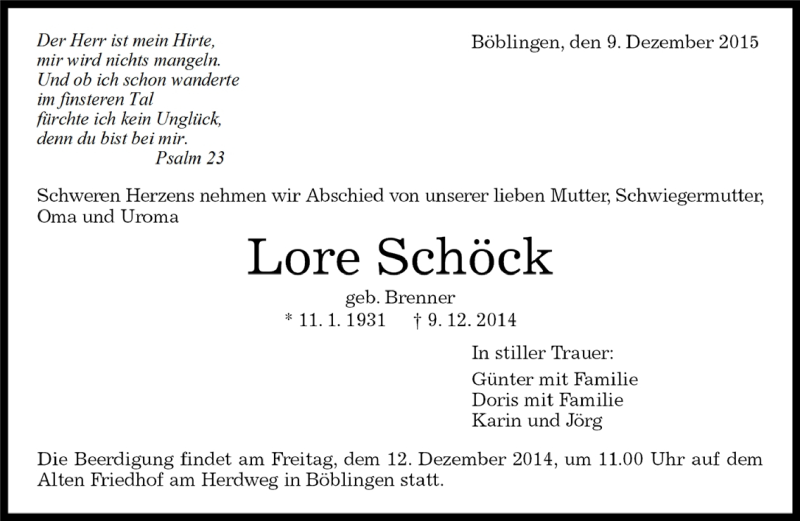 Hier finden Sie alle Traueranzeigen aus der Zeitung, die bisher für Lore Schöck erschienen sind. Weitere Traueranzeigen, die in der Zeitung erscheinen, werden hier ebenfalls aufgelistet
