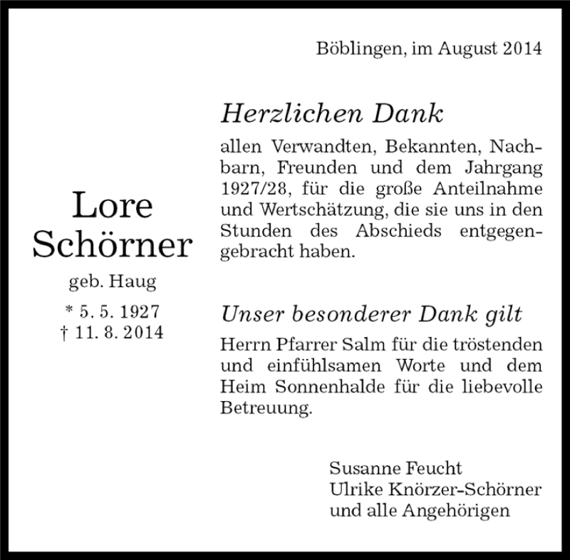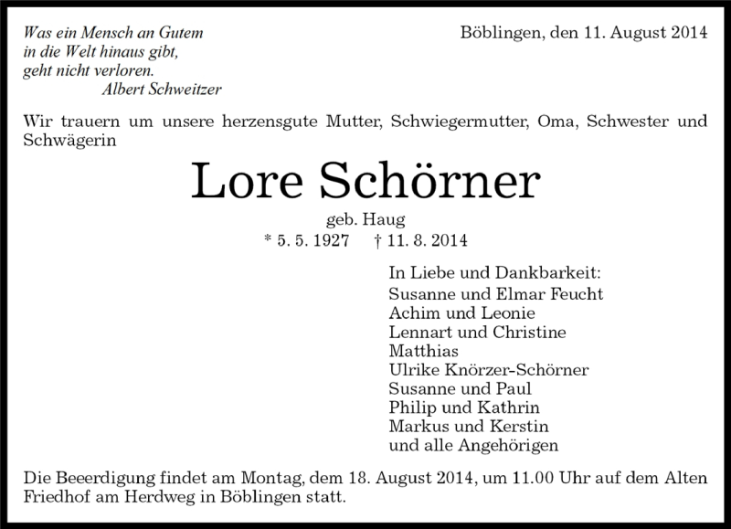 Hier finden Sie alle Traueranzeigen aus der Zeitung, die bisher für Lore Schörner erschienen sind. Weitere Traueranzeigen, die in der Zeitung erscheinen, werden hier ebenfalls aufgelistet