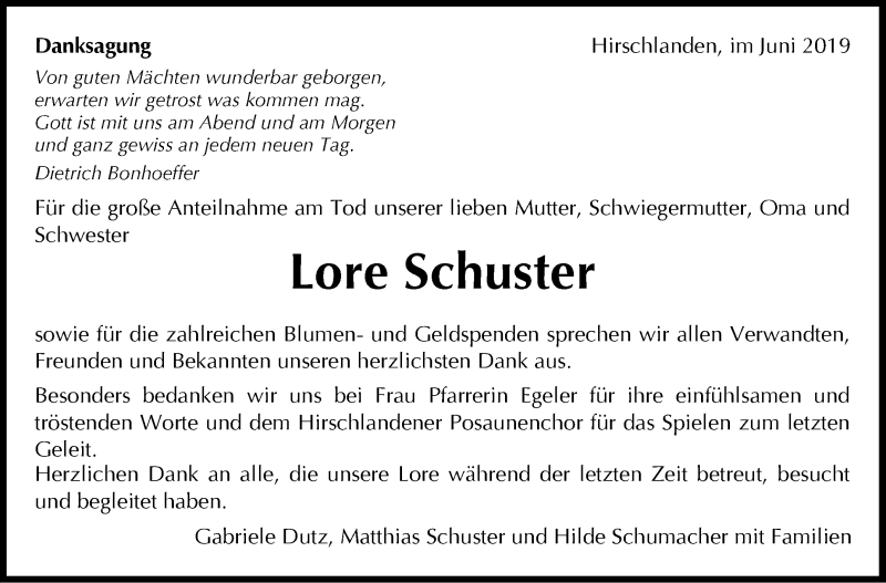 Hier finden Sie alle Traueranzeigen aus der Zeitung, die bisher für Lore Schuster erschienen sind. Weitere Traueranzeigen, die in der Zeitung erscheinen, werden hier ebenfalls aufgelistet