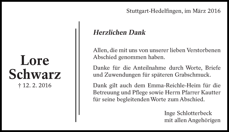 Hier finden Sie alle Traueranzeigen aus der Zeitung, die bisher für Lore Schwarz erschienen sind. Weitere Traueranzeigen, die in der Zeitung erscheinen, werden hier ebenfalls aufgelistet