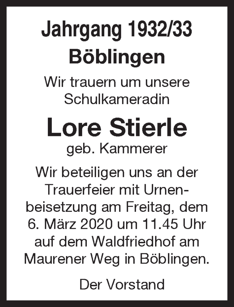 Hier finden Sie alle Traueranzeigen aus der Zeitung, die bisher für Lore Stierle erschienen sind. Weitere Traueranzeigen, die in der Zeitung erscheinen, werden hier ebenfalls aufgelistet