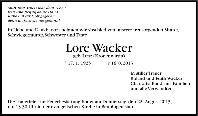 Hier finden Sie alle Traueranzeigen aus der Zeitung, die bisher für Lore Wacker erschienen sind. Weitere Traueranzeigen, die in der Zeitung erscheinen, werden hier ebenfalls aufgelistet