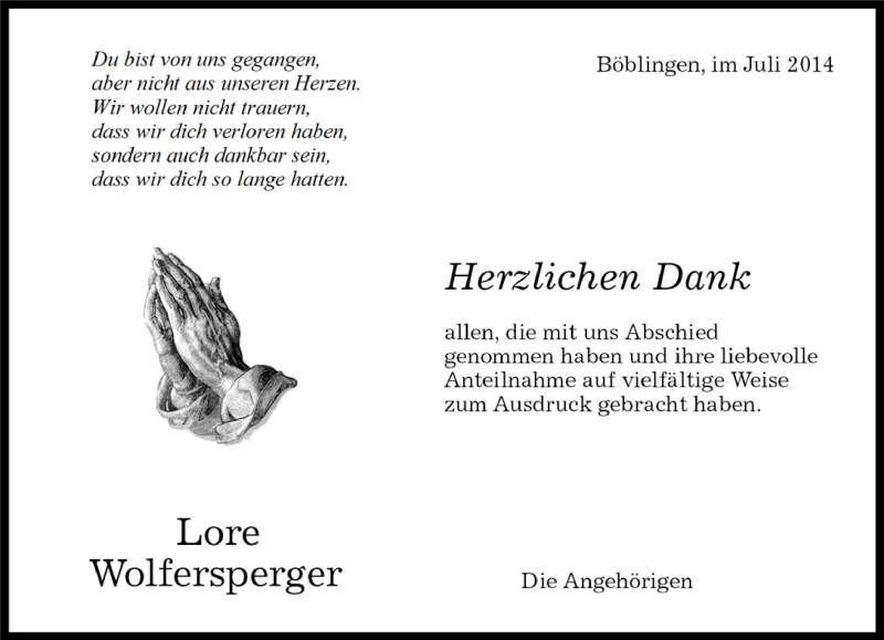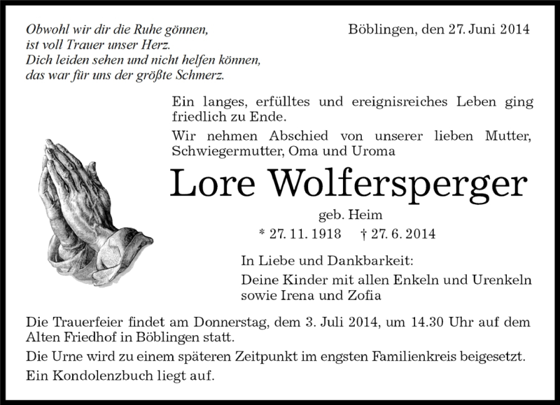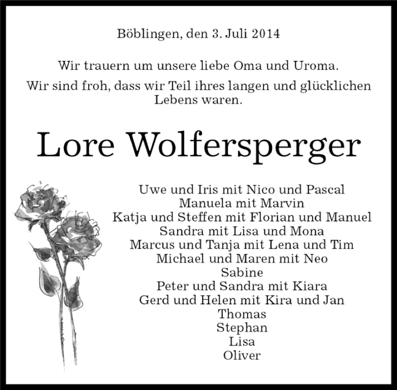 Hier finden Sie alle Traueranzeigen aus der Zeitung, die bisher für Lore Wolfersperger erschienen sind. Weitere Traueranzeigen, die in der Zeitung erscheinen, werden hier ebenfalls aufgelistet