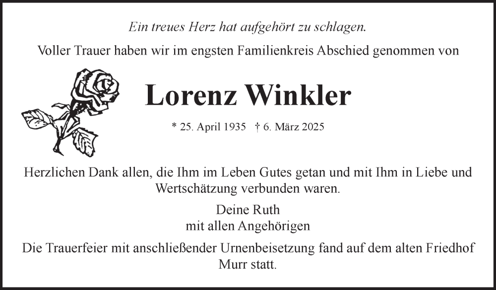Hier finden Sie alle Traueranzeigen aus der Zeitung, die bisher für Lorenz Winkler erschienen sind. Weitere Traueranzeigen, die in der Zeitung erscheinen, werden hier ebenfalls aufgelistet