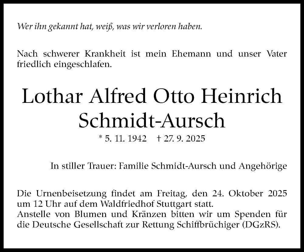 Hier finden Sie alle Traueranzeigen aus der Zeitung, die bisher für Lothar Alfred Otto Heinrich Schmidt-Aursch erschienen sind. Weitere Traueranzeigen, die in der Zeitung erscheinen, werden hier ebenfalls aufgelistet