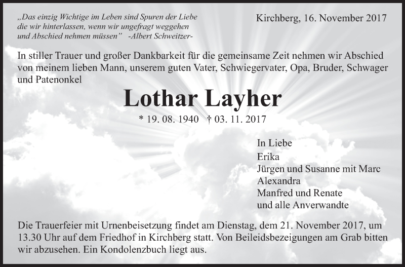 Hier finden Sie alle Traueranzeigen aus der Zeitung, die bisher für Lothar Layher erschienen sind. Weitere Traueranzeigen, die in der Zeitung erscheinen, werden hier ebenfalls aufgelistet
