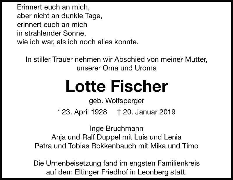 Hier finden Sie alle Traueranzeigen aus der Zeitung, die bisher für Lotte Fischer erschienen sind. Weitere Traueranzeigen, die in der Zeitung erscheinen, werden hier ebenfalls aufgelistet