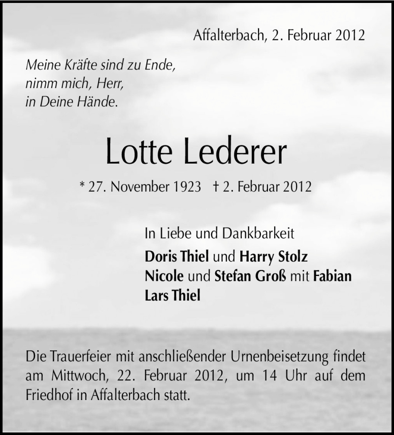 Hier finden Sie alle Traueranzeigen aus der Zeitung, die bisher für Lotte Lederer erschienen sind. Weitere Traueranzeigen, die in der Zeitung erscheinen, werden hier ebenfalls aufgelistet