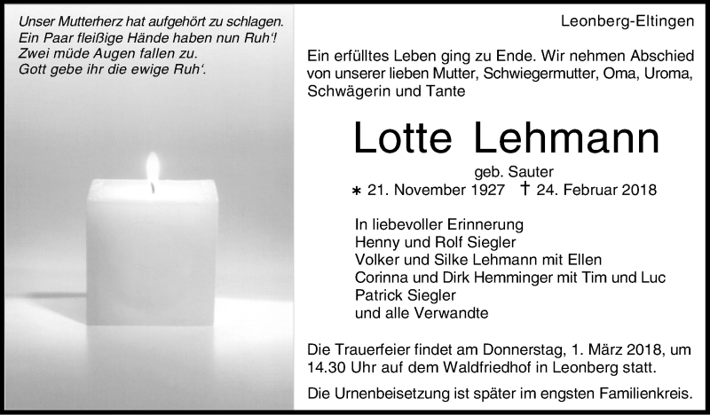 Hier finden Sie alle Traueranzeigen aus der Zeitung, die bisher für Lotte Lehmann erschienen sind. Weitere Traueranzeigen, die in der Zeitung erscheinen, werden hier ebenfalls aufgelistet