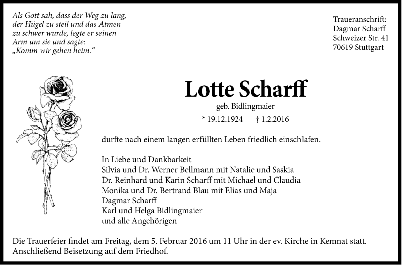 Hier finden Sie alle Traueranzeigen aus der Zeitung, die bisher für Lotte Scharff erschienen sind. Weitere Traueranzeigen, die in der Zeitung erscheinen, werden hier ebenfalls aufgelistet