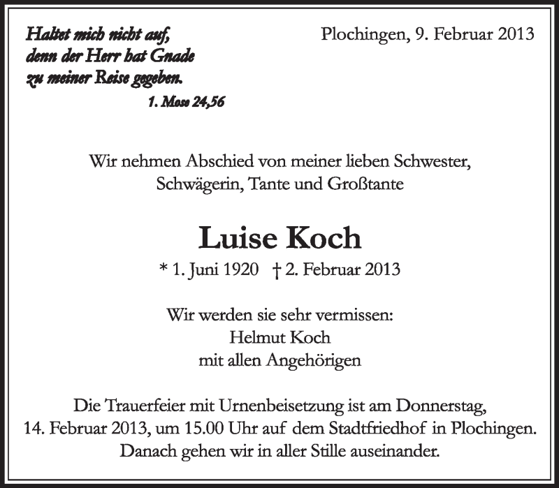 Hier finden Sie alle Traueranzeigen aus der Zeitung, die bisher für Luise Koch erschienen sind. Weitere Traueranzeigen, die in der Zeitung erscheinen, werden hier ebenfalls aufgelistet