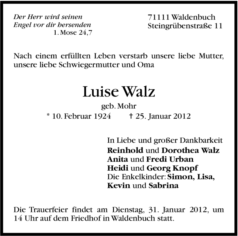 Hier finden Sie alle Traueranzeigen aus der Zeitung, die bisher für Luise Walz erschienen sind. Weitere Traueranzeigen, die in der Zeitung erscheinen, werden hier ebenfalls aufgelistet