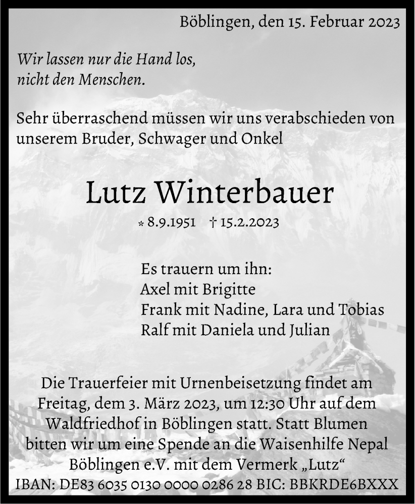 Hier finden Sie alle Traueranzeigen aus der Zeitung, die bisher für Lutz Winterbauer erschienen sind. Weitere Traueranzeigen, die in der Zeitung erscheinen, werden hier ebenfalls aufgelistet