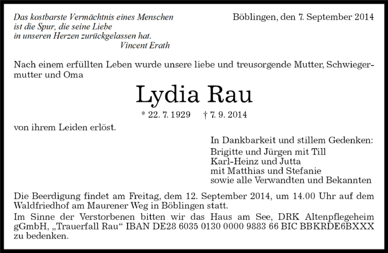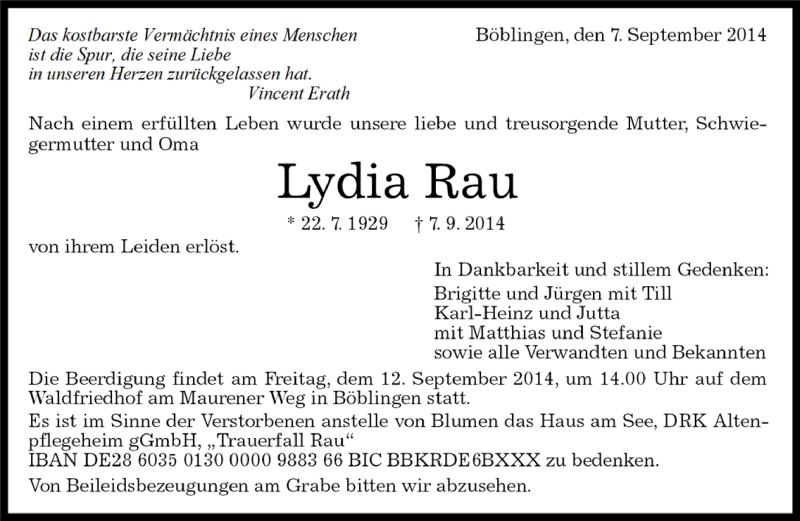 Hier finden Sie alle Traueranzeigen aus der Zeitung, die bisher für Lydia Rau erschienen sind. Weitere Traueranzeigen, die in der Zeitung erscheinen, werden hier ebenfalls aufgelistet