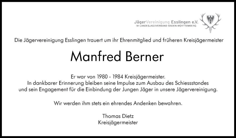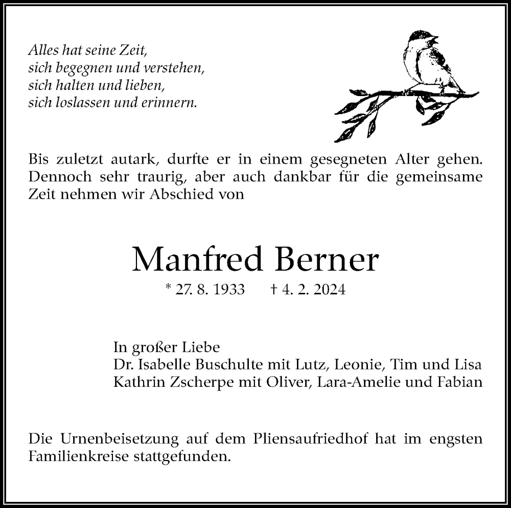 Hier finden Sie alle Traueranzeigen aus der Zeitung, die bisher für Manfred Berner erschienen sind. Weitere Traueranzeigen, die in der Zeitung erscheinen, werden hier ebenfalls aufgelistet
