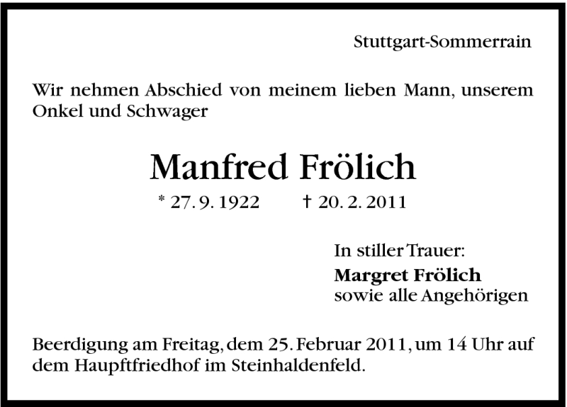 Hier finden Sie alle Traueranzeigen aus der Zeitung, die bisher für Manfred Frölich erschienen sind. Weitere Traueranzeigen, die in der Zeitung erscheinen, werden hier ebenfalls aufgelistet