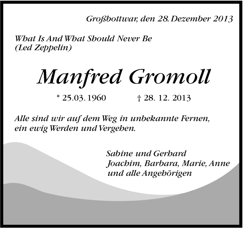 Hier finden Sie alle Traueranzeigen aus der Zeitung, die bisher für Manfred Gromoll erschienen sind. Weitere Traueranzeigen, die in der Zeitung erscheinen, werden hier ebenfalls aufgelistet