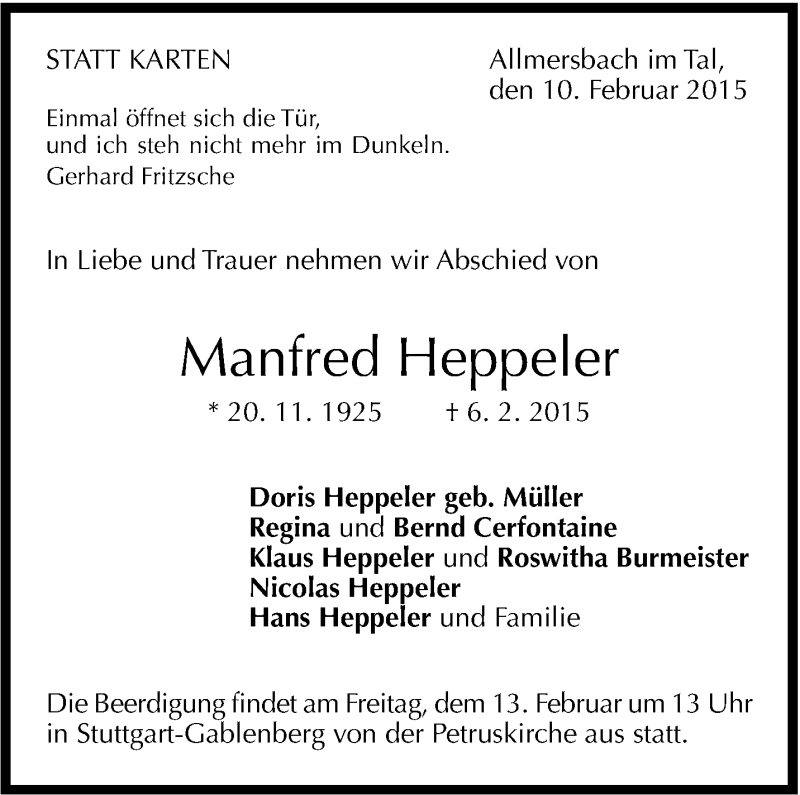 Hier finden Sie alle Traueranzeigen aus der Zeitung, die bisher für Manfred Heppeler erschienen sind. Weitere Traueranzeigen, die in der Zeitung erscheinen, werden hier ebenfalls aufgelistet