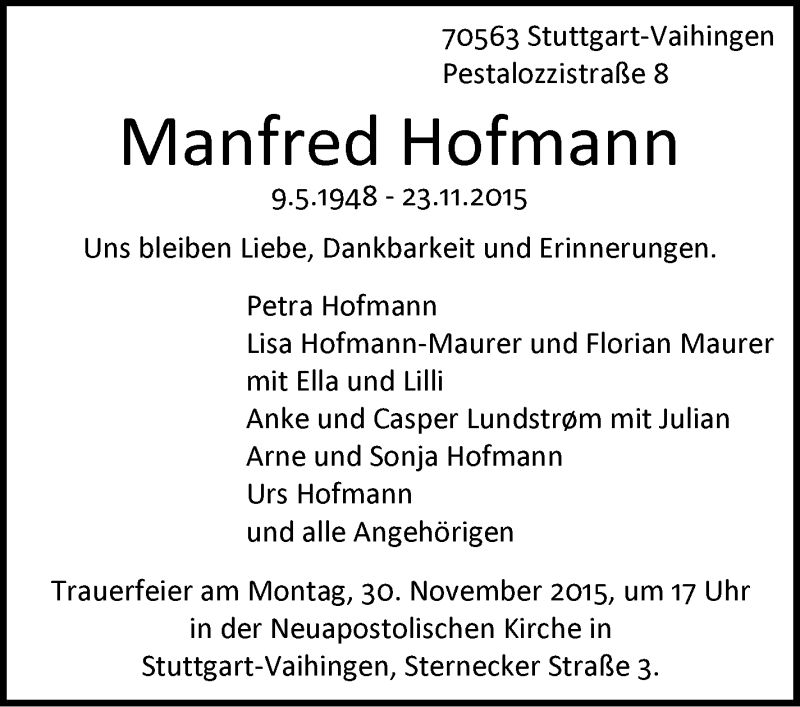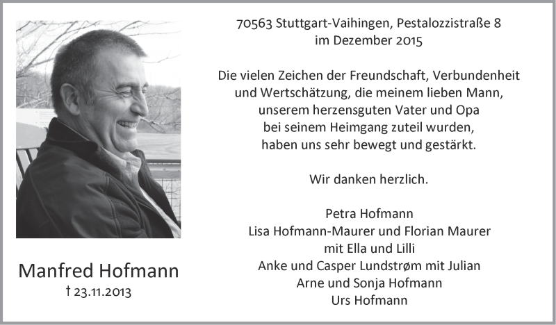 Hier finden Sie alle Traueranzeigen aus der Zeitung, die bisher für Manfred Hofmann erschienen sind. Weitere Traueranzeigen, die in der Zeitung erscheinen, werden hier ebenfalls aufgelistet