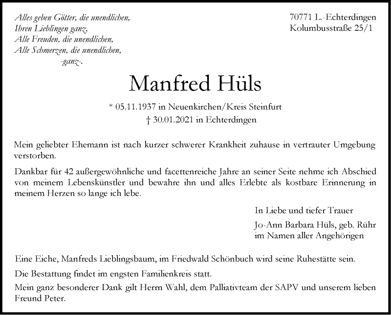 Hier finden Sie alle Traueranzeigen aus der Zeitung, die bisher für Manfred Hüls erschienen sind. Weitere Traueranzeigen, die in der Zeitung erscheinen, werden hier ebenfalls aufgelistet