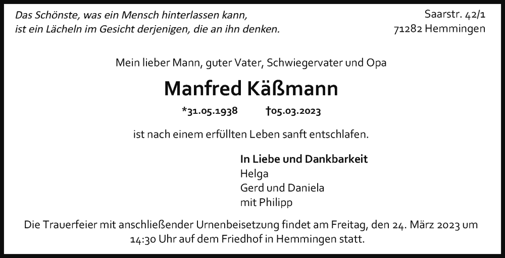 Hier finden Sie alle Traueranzeigen aus der Zeitung, die bisher für Manfred Käßmann erschienen sind. Weitere Traueranzeigen, die in der Zeitung erscheinen, werden hier ebenfalls aufgelistet