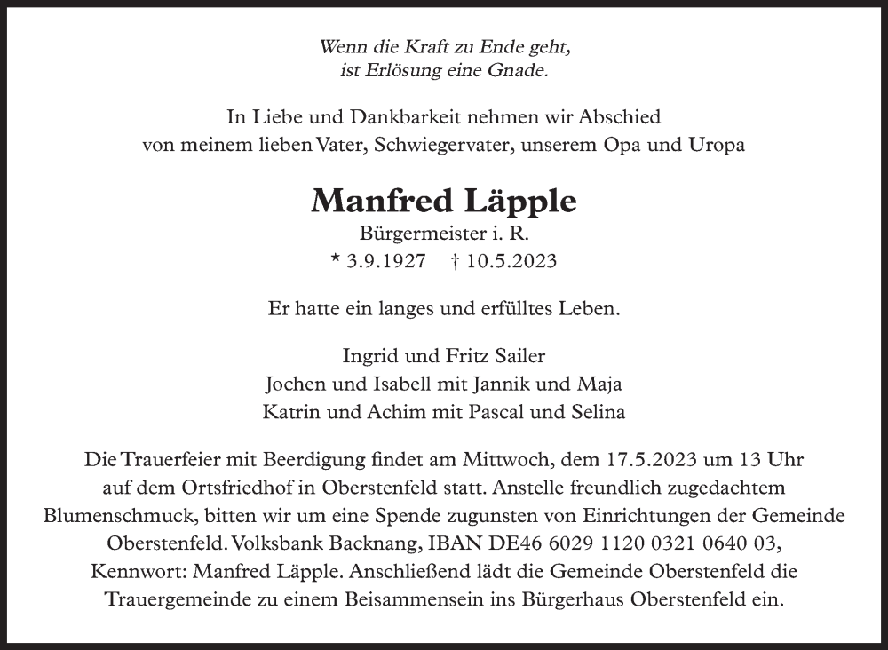 Hier finden Sie alle Traueranzeigen aus der Zeitung, die bisher für Manfred Läpple erschienen sind. Weitere Traueranzeigen, die in der Zeitung erscheinen, werden hier ebenfalls aufgelistet