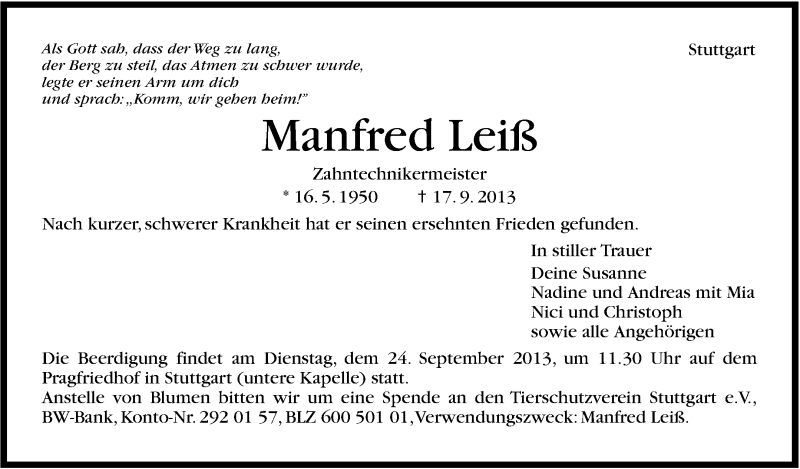 Hier finden Sie alle Traueranzeigen aus der Zeitung, die bisher für Manfred Leiß erschienen sind. Weitere Traueranzeigen, die in der Zeitung erscheinen, werden hier ebenfalls aufgelistet