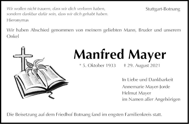 Hier finden Sie alle Traueranzeigen aus der Zeitung, die bisher für Manfred Mayer erschienen sind. Weitere Traueranzeigen, die in der Zeitung erscheinen, werden hier ebenfalls aufgelistet