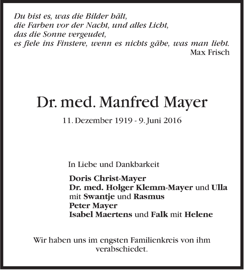 Hier finden Sie alle Traueranzeigen aus der Zeitung, die bisher für Manfred Mayer erschienen sind. Weitere Traueranzeigen, die in der Zeitung erscheinen, werden hier ebenfalls aufgelistet