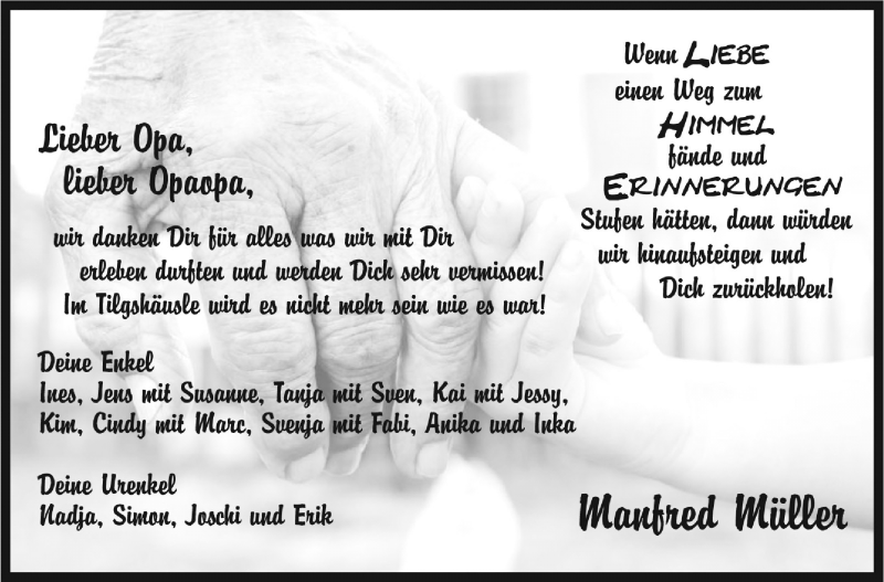Hier finden Sie alle Traueranzeigen aus der Zeitung, die bisher für Manfred Müller erschienen sind. Weitere Traueranzeigen, die in der Zeitung erscheinen, werden hier ebenfalls aufgelistet